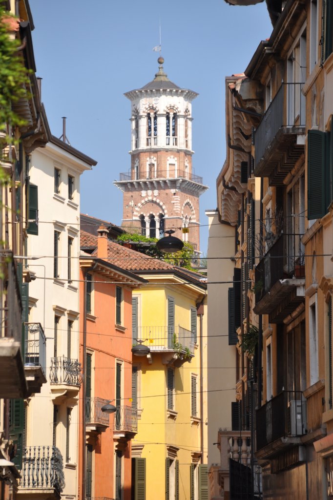 VERONA (Provinz Verona), 28.09.2011, Blick von der Ponte Giuseppe Garibaldi über die Etsch auf den Turm des Doms