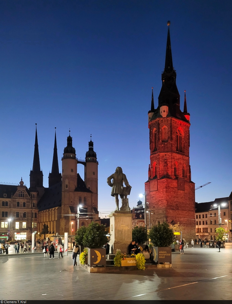 Wenn Komponist Georg Friedrich Händel zum Himmel schaut: Blaue Stunde auf dem Marktplatz in Halle (Saale), mit Marktkirche Unser Lieben Frauen (links), Händel-Denkmal und dem Roten Turm. 🕓 25.10.2024 | 18:39 Uhr