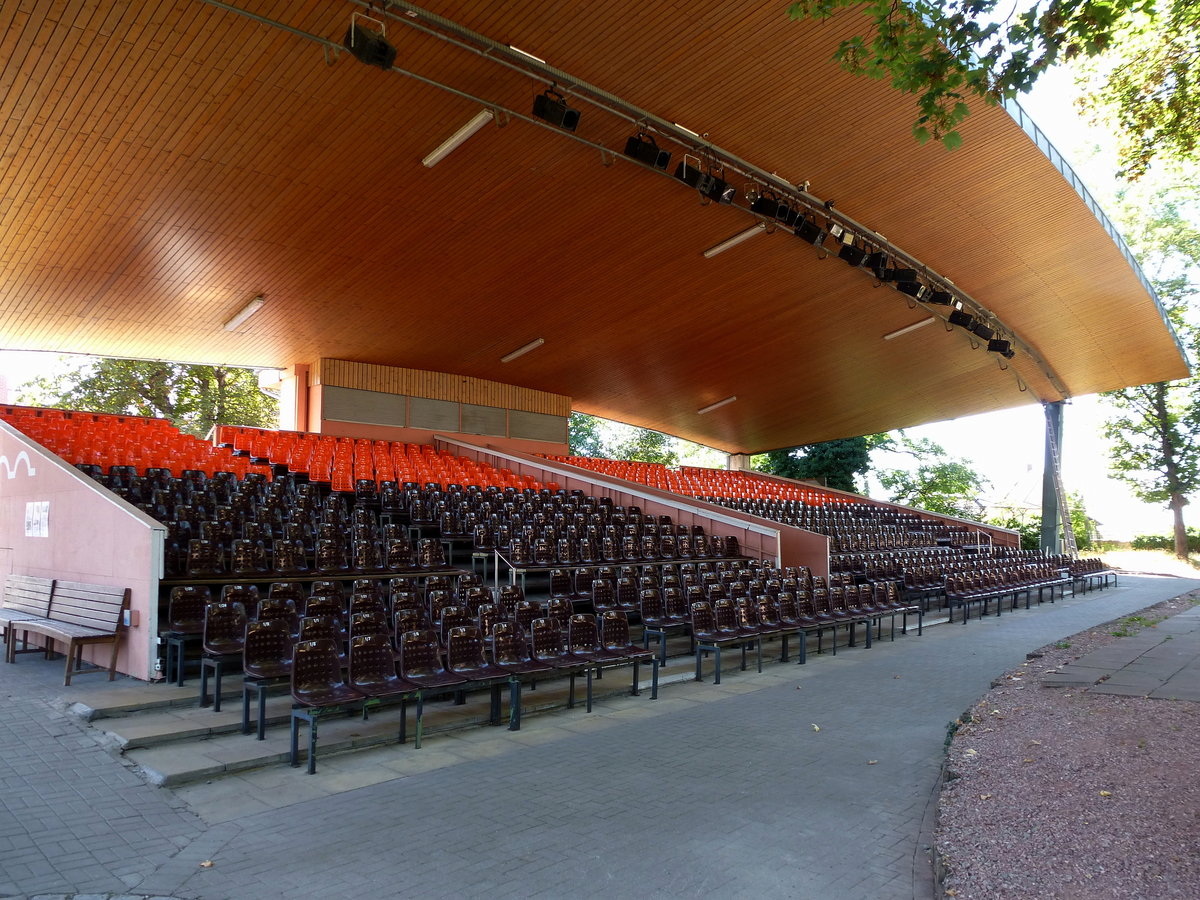 Breisach, der überdachte Zuschauerbereich mit 748 Sitzplätzen der Freilichtbühne auf dem Burgberg, die hier jährlich stattfindenden Breisacher Festspiele wurden 1924 gegründet, Aug.2015 rainer ullrich