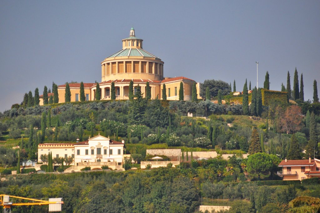 Blick über die Etsch in Verona auf die Ponte Pietra, gebaut um 100v. Chr. mit im Hintergrund Die Wallfahrtskirche Madonna di Lourdes die auf dem Hügel San Leonardo steht. 05.2025 (Handyfoto Jeanne) De Rond Hans und Jeanny