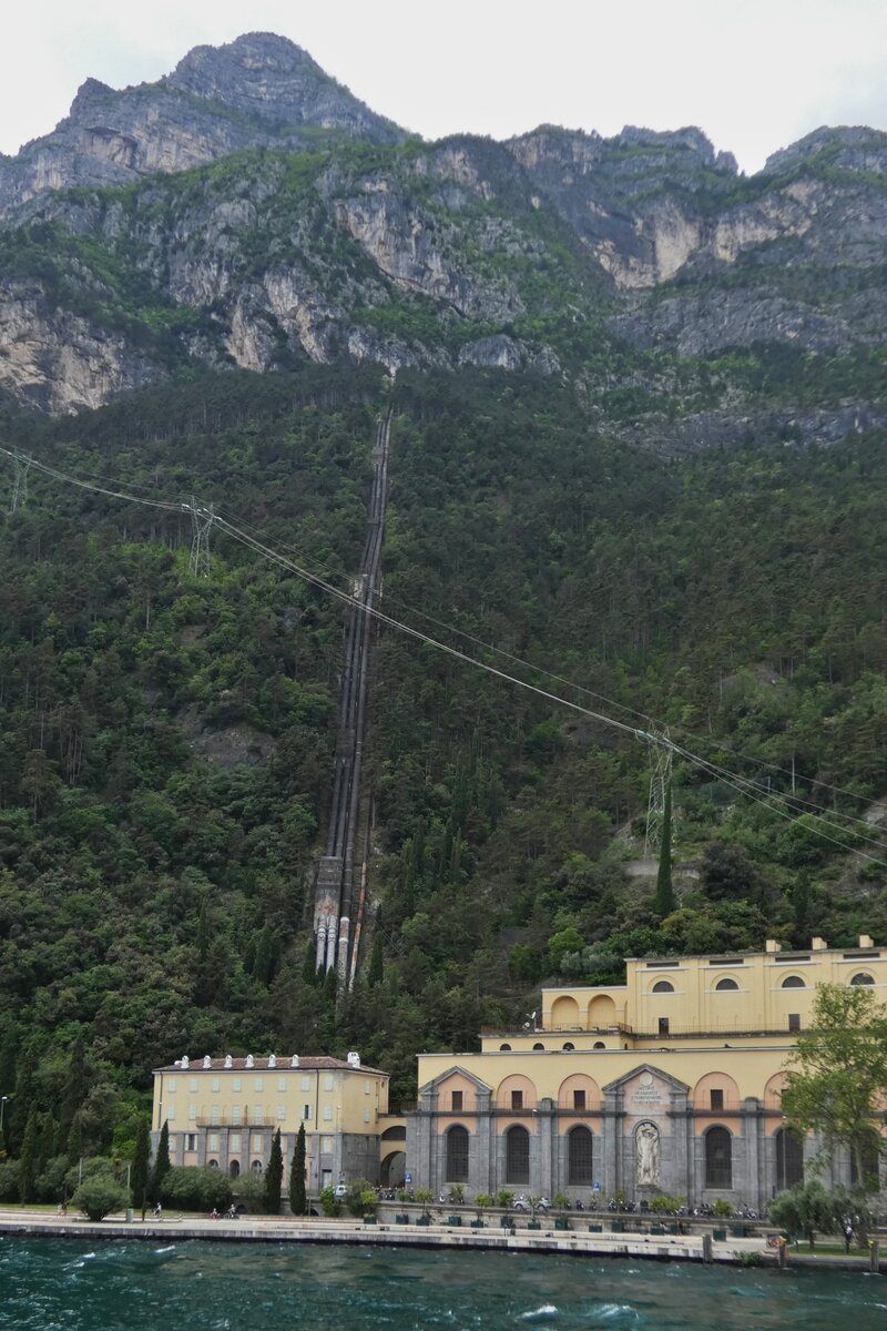 Das Wasserkraftwerk mit den Versorgungsrohren aus den Bergen am Rande des Gardasees in Riva del Garda. 05.2025