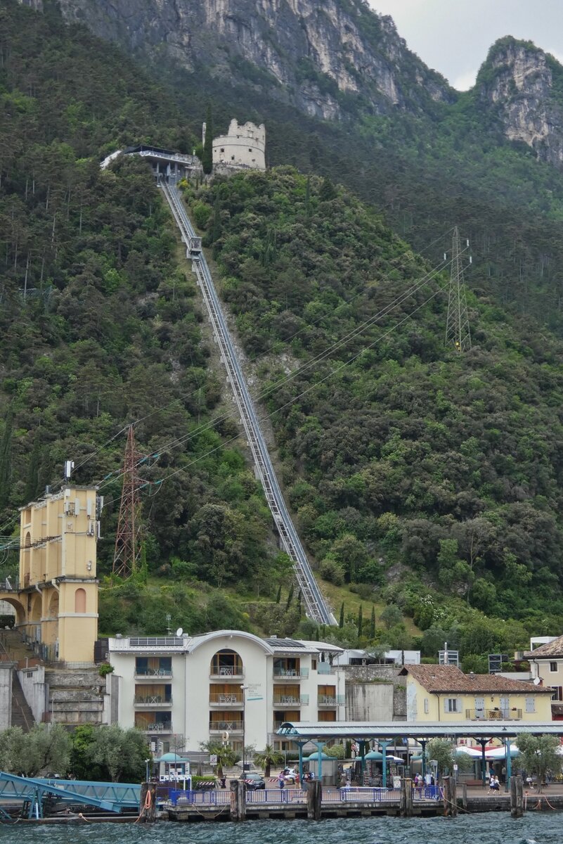 Panorama Standseilbahn nahe dem Schiffsanleger in Riva del Garda zur Bastion von Riva, hoch über Riva del Garda am Gardasee. 05.2025