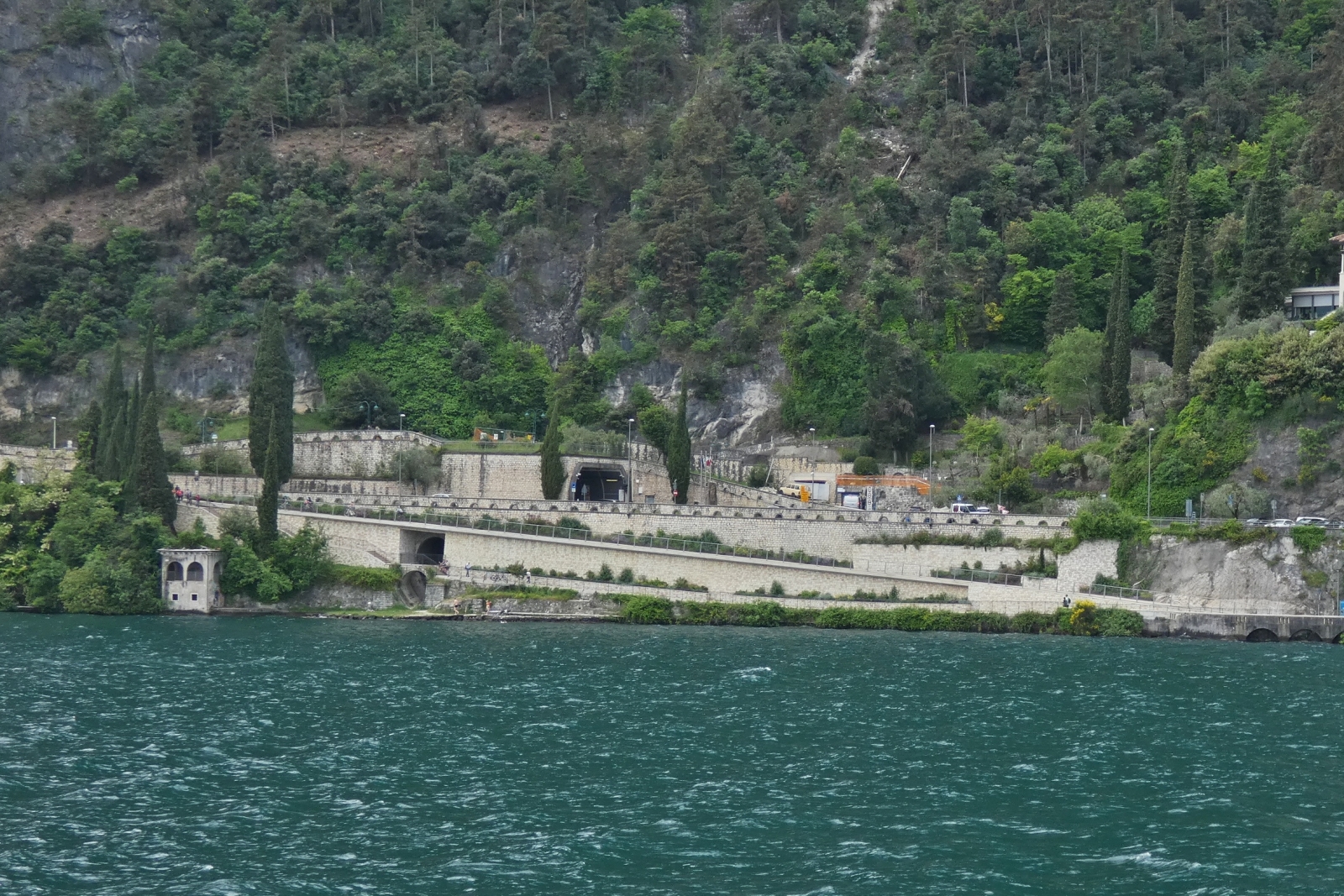 Hotel Capo Reamol am Ufer des Gardasees, oben am Felsen wurde ein Fußgänger- und Fahrradweg am Felsentunnel vorbei gebaut. 05.2025