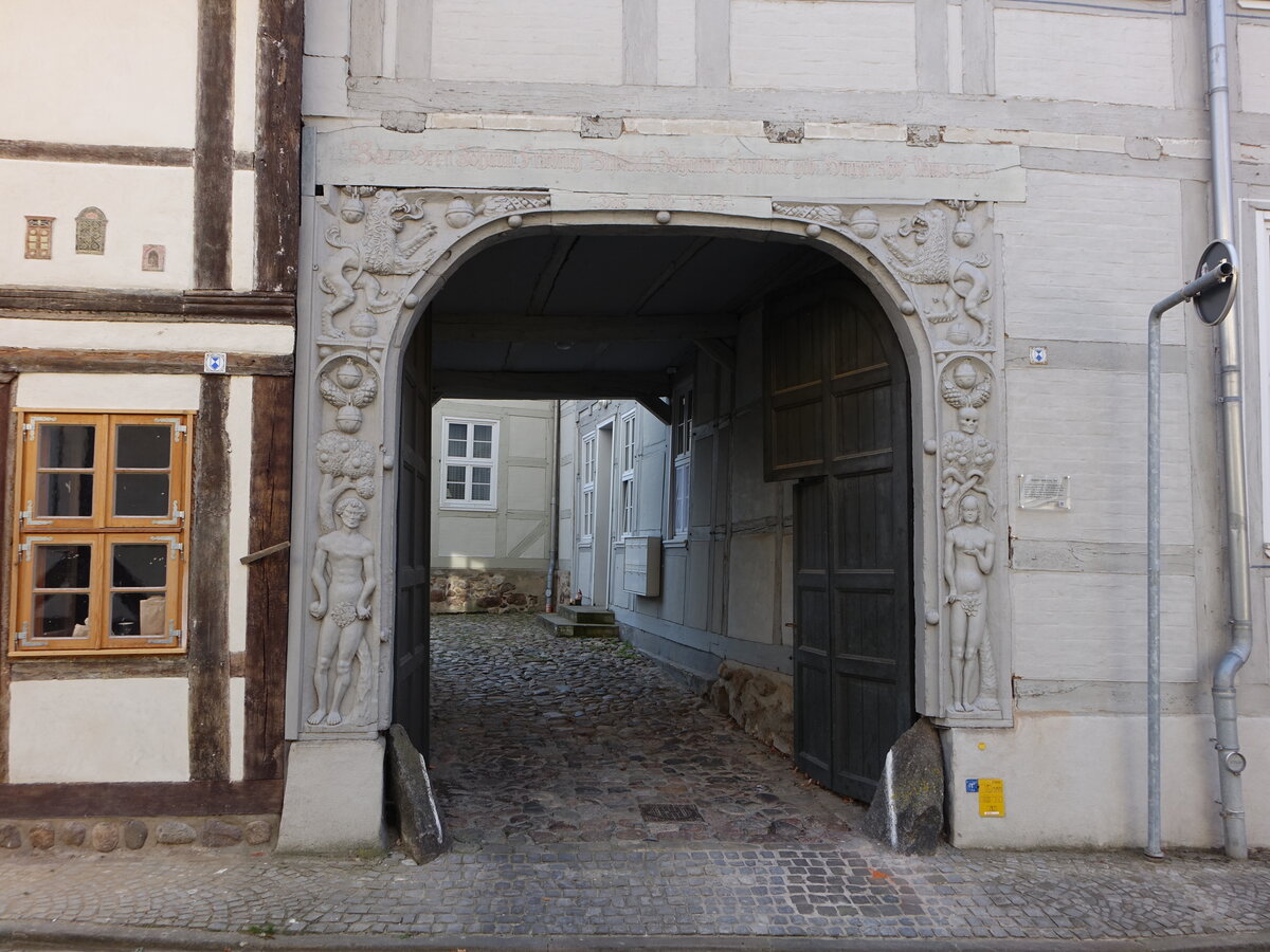 Salzwedel, Adam und Eva Tor in der Schmiedestraße, Holzportal mit den im Paradiesgarten stehenden Relieffiguren von Adam und Eva, erbaut 1534 (14.08.2025)