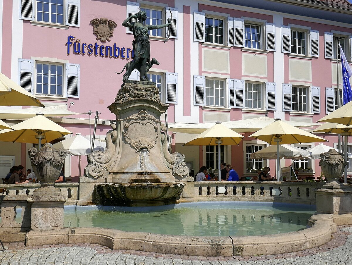 Donaueschingen, die Donauquelle nahe dem Fürstenschloß, mit der Skulpturengruppe "Mutter Baar mit Tochter Donau" von Adolf von Heer von 1895, Aug.2025 rainer ullrich