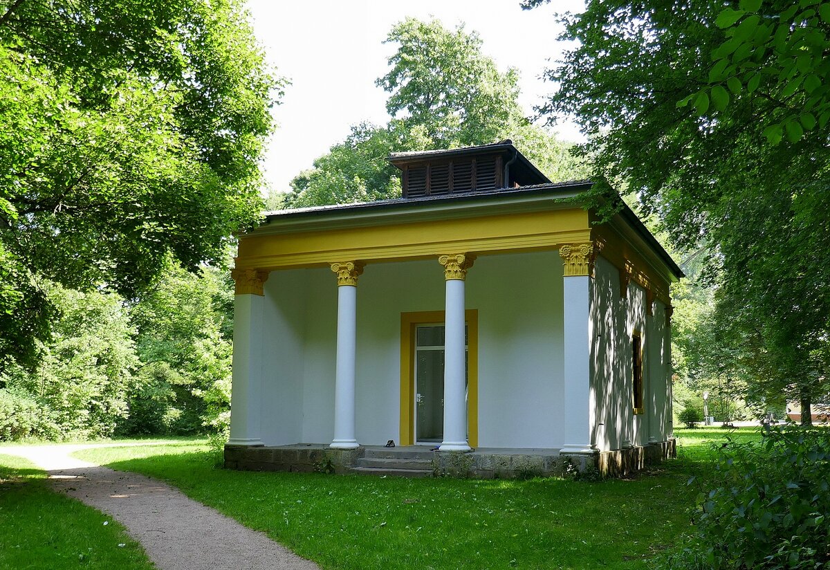 Donaueschingen, das Fischhaus im Stil griechischer Tempel, steht im Schloßpark, war der Arbeitsplatz des fürstlichen Hoffischers, Aug.2025 rainer ullrich