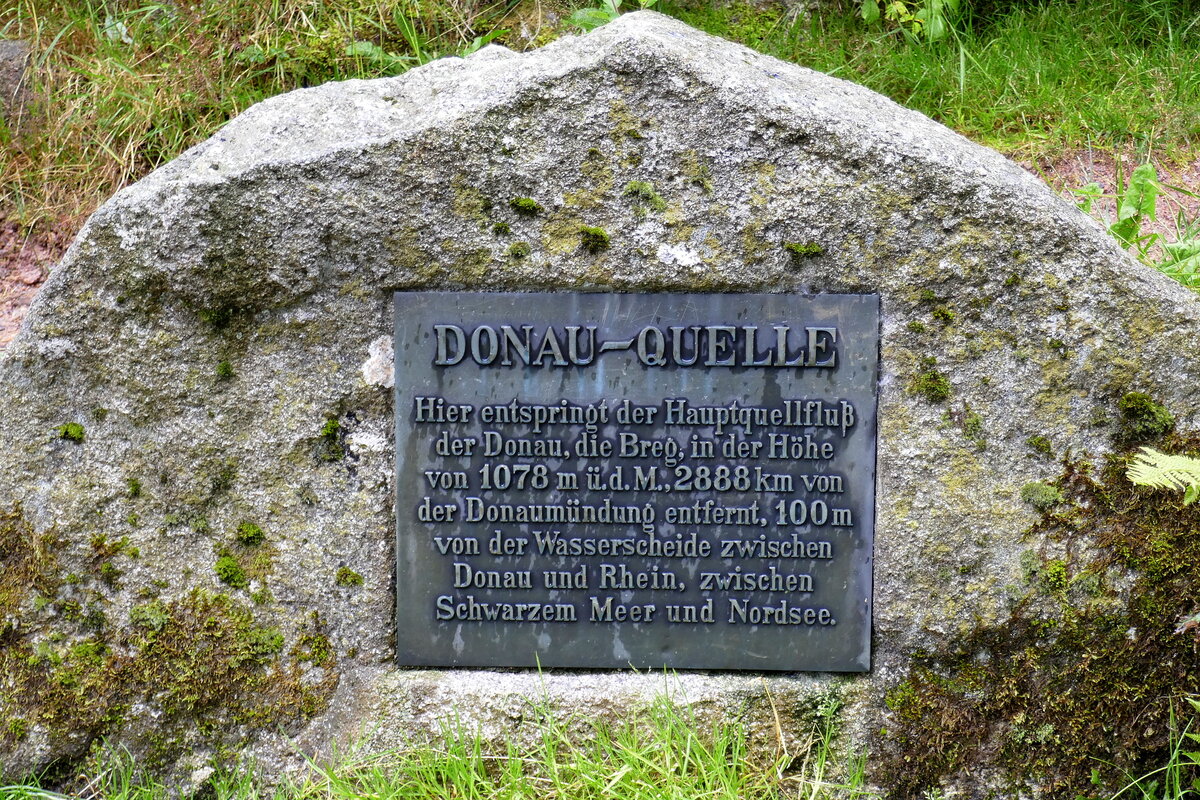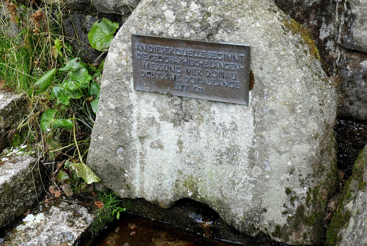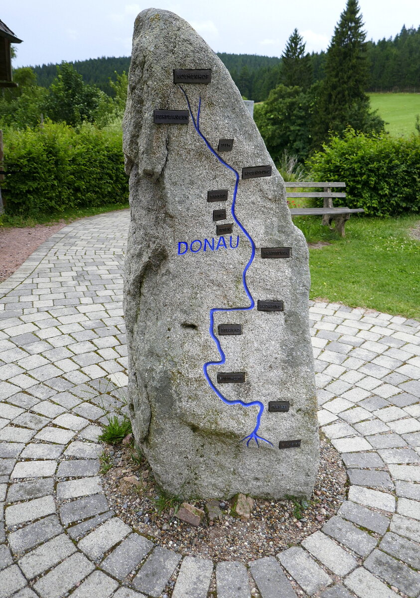 Furtwangen im Schwarzwald, der Stein mit dem Flußverlauf steht an der Donauquelle, genauer an der Quelle der Brig, dem längsten Quellfluß der Donau, Juli 2025 rainer ullrich
