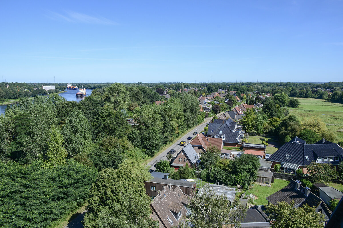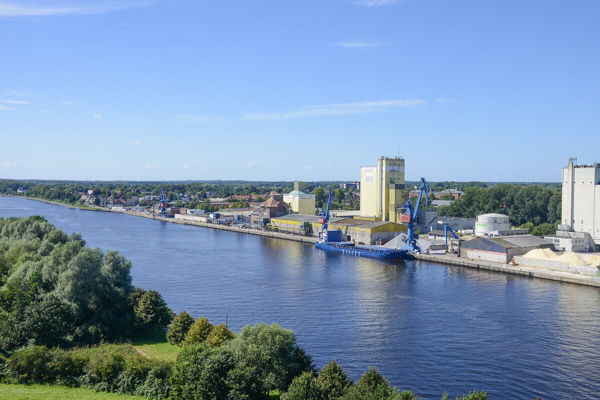 Detailaufnahme der Rendsburger Hochbrücke. Die Brücke überspannt den Nord-Ostsee-Kanal und dient als Eisenbahnbrücke, außerdem trägt sie eine angehängte Schwebefähre für den Fußgänger- und Fahrzeugverkehr. Sie ist Wahrzeichen der Stadt Rendsburg und eines der bedeutenden Technikdenkmäler in Deutschland. 2013 wurde sie von der Bundesingenieurkammer als Historisches Wahrzeichen der Ingenieurbaukunst in Deutschland ausgezeichnet Direkt unter der Brücke befindet sich die Schiffsbegrüßungsanlage Rendsburg. Aufnahme: 7. März 2022.