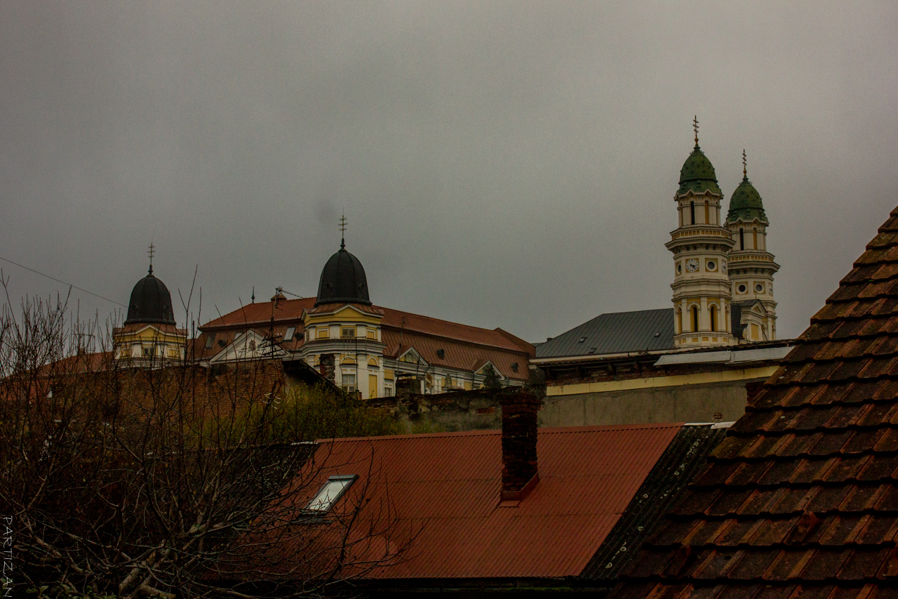 Die griechisch-katholische Kathedrale von Uzhhorod aus den Fenstern der Musikhochschule / Uzhhorod, Ukraine / 28.11.2024