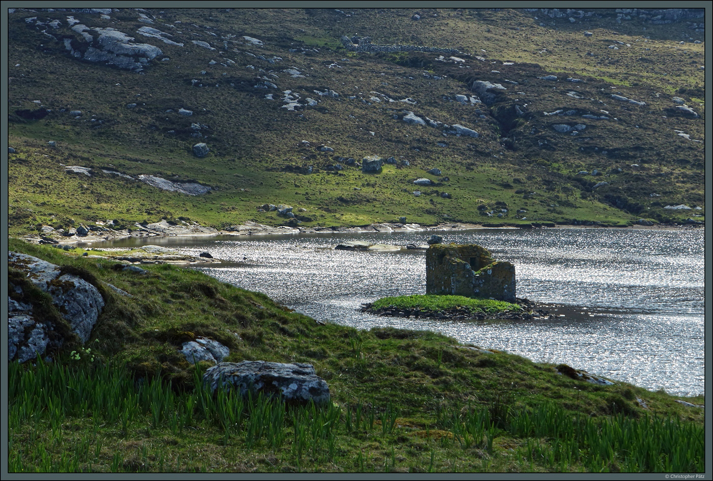 Auf einer winzigen Insel im Loch Tangasdale steht der Mac Leod's Tower, ein kleiner mittelalterlicher Wehrturm. (Barra, 09.05.2025)