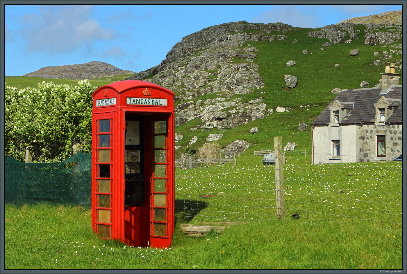 Eine verlassene Telefonzelle steht in der kleinen Siedlung Tangasdal im Westen von Barra. (09.05.2025)