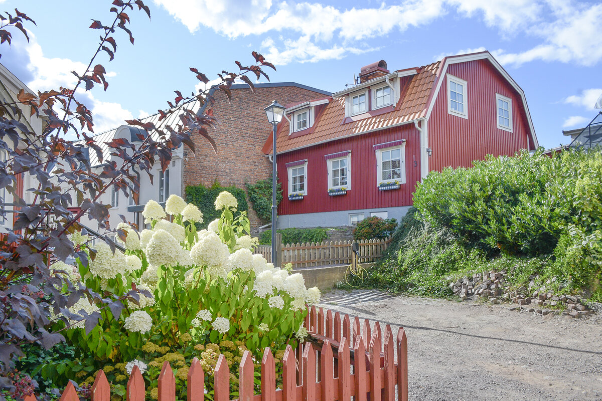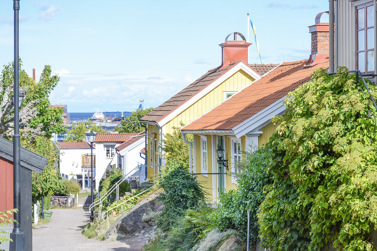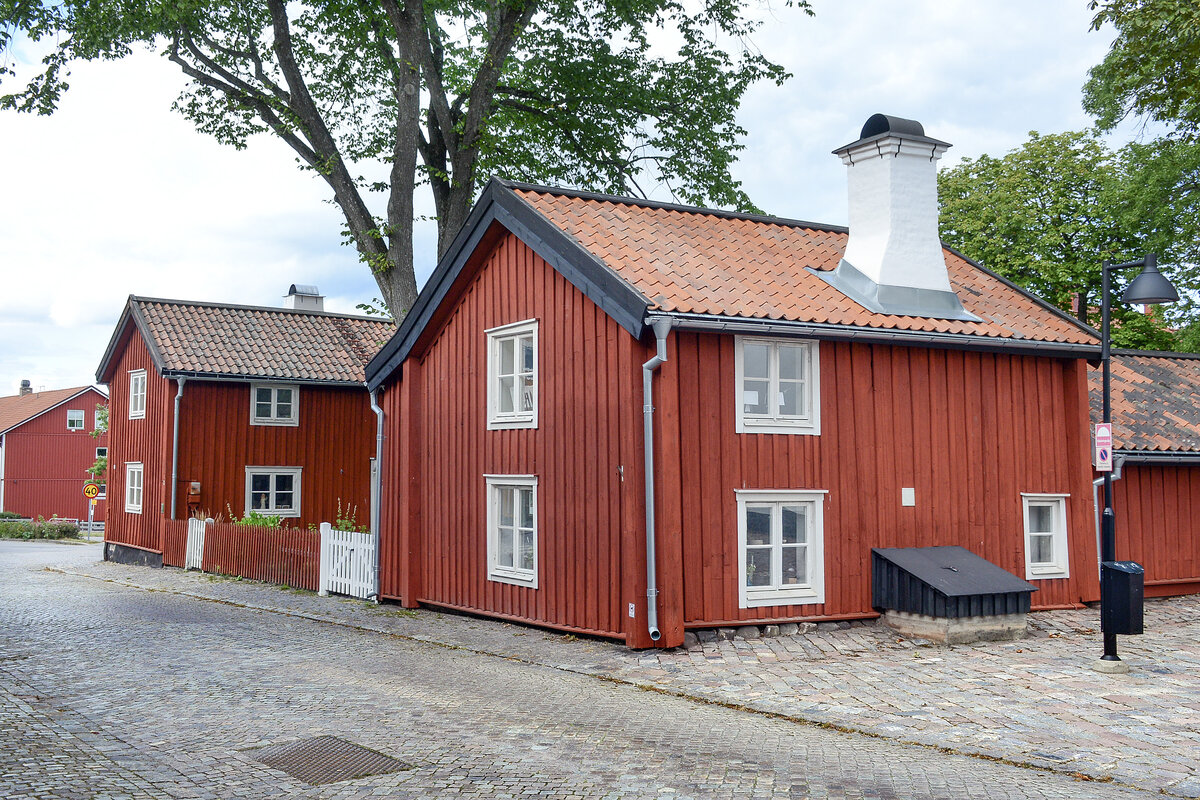 Västervik in Småland (Schweden): Bunte Fischerhaüser aus dem 19. Jahhundert. Aufnahme: 20. August 2025.