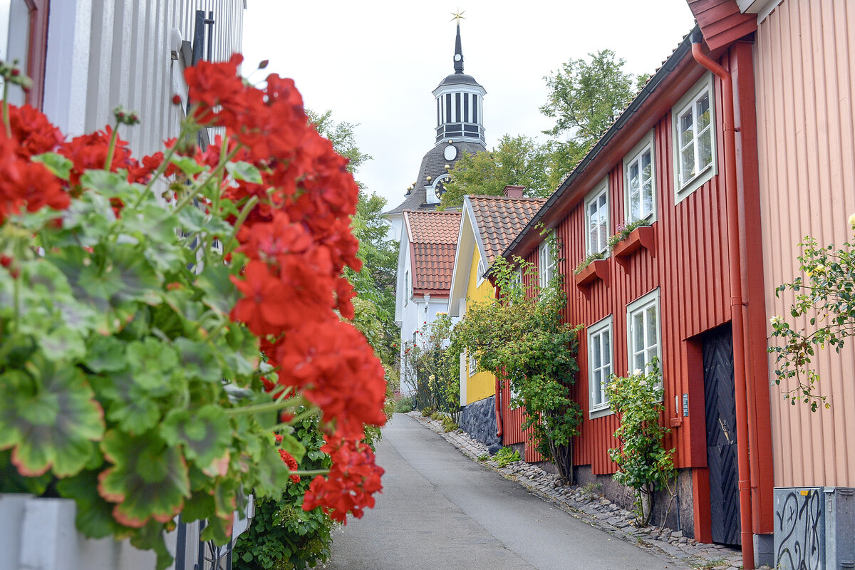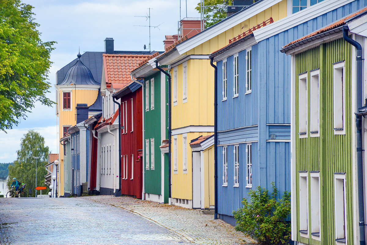 Farbige Holzhäuser in Rådhusgatan in Västervik (Småland, Schweden). Aufnahme: 20. August 2025.