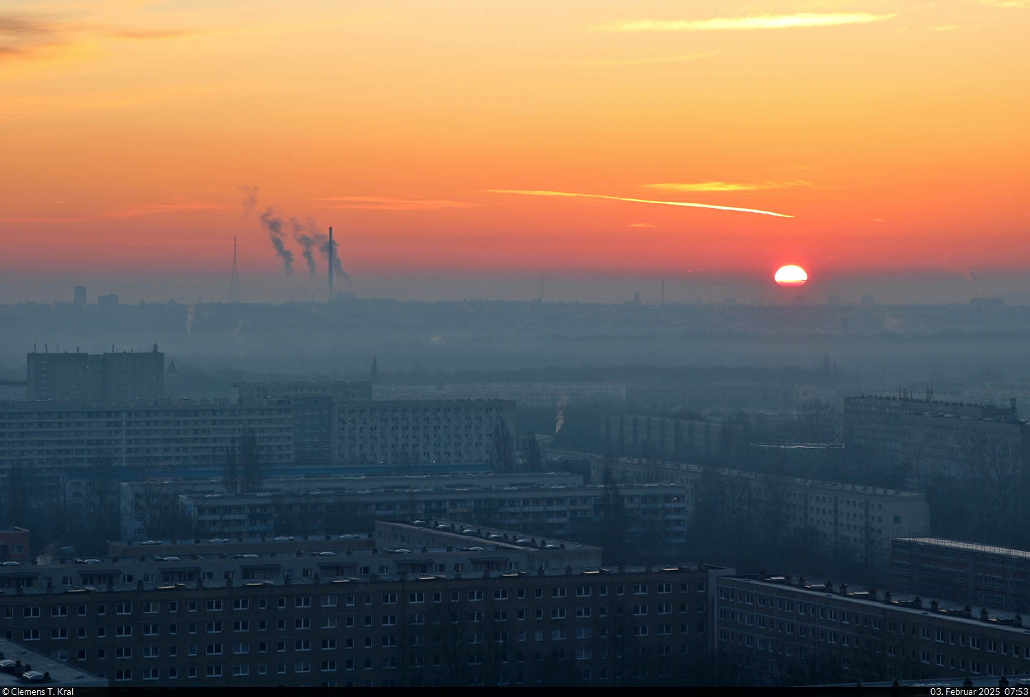 Wenn die Sonne sich über den Blöcken erhebt: Tele-Sicht auf Halle-Neustadt an einem frostigen Morgen.