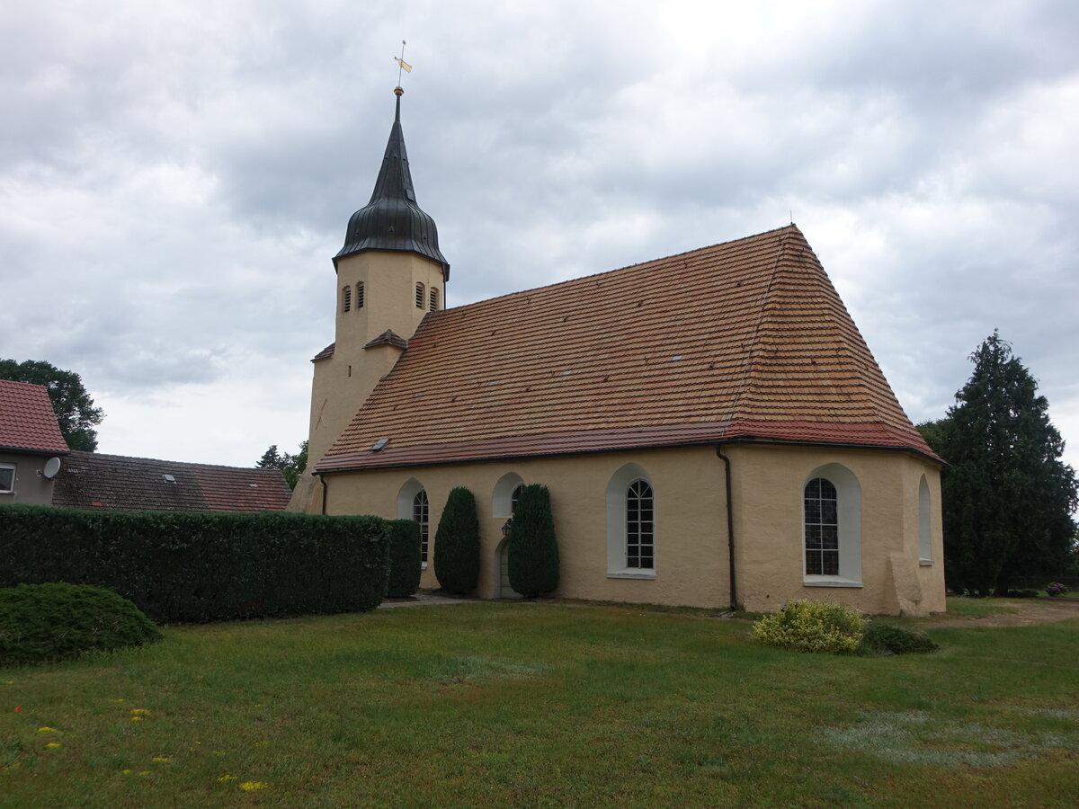 Buckow, evangelische Kirche, erbaut im 14. Jahrhundert, Westturm erbaut 1671 (08.06.2025)