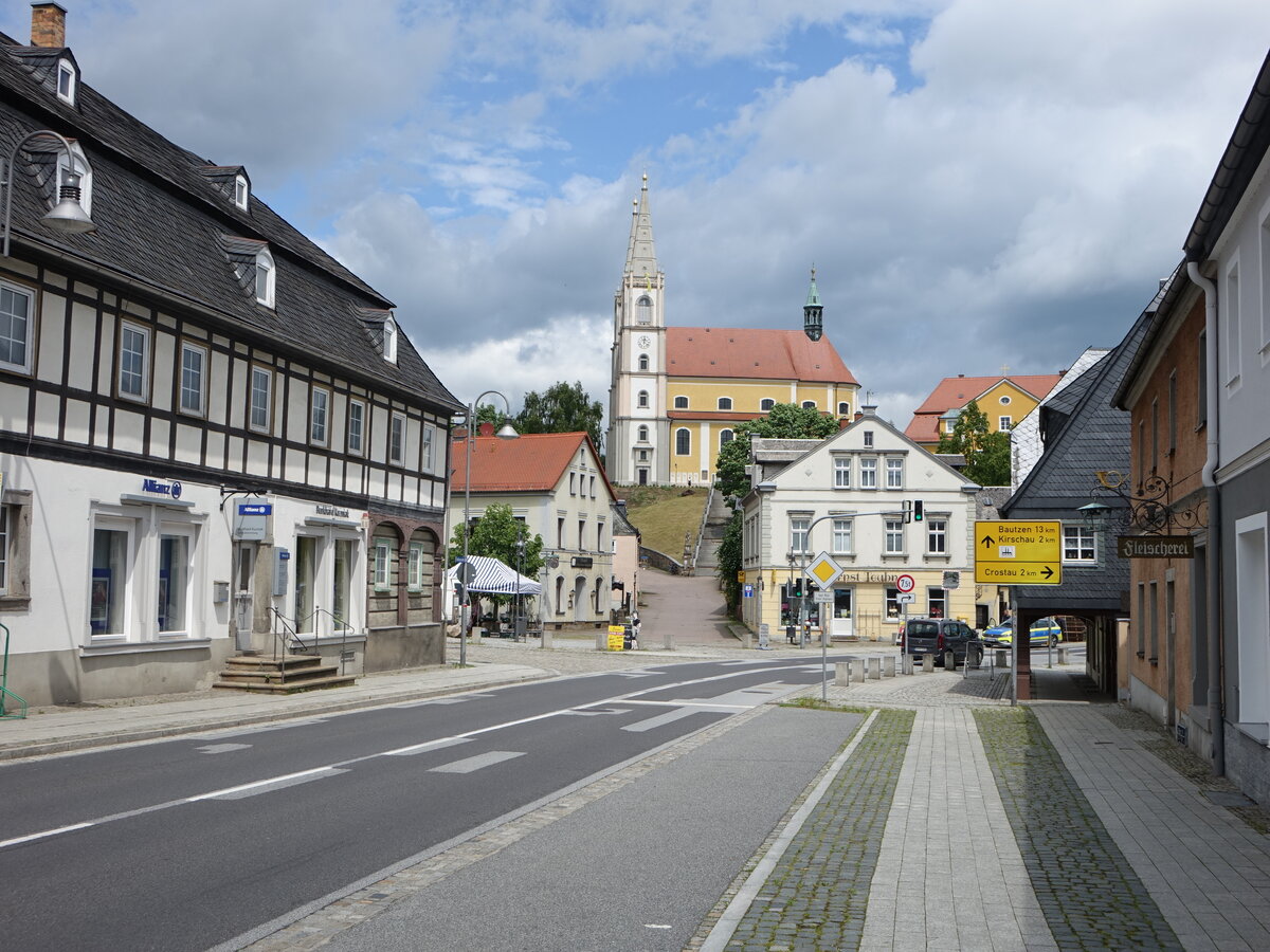 Schirgiswalde, Häuser und Maria Himmelfahrt Kirche in der Rathausstraße (06.06.2025)