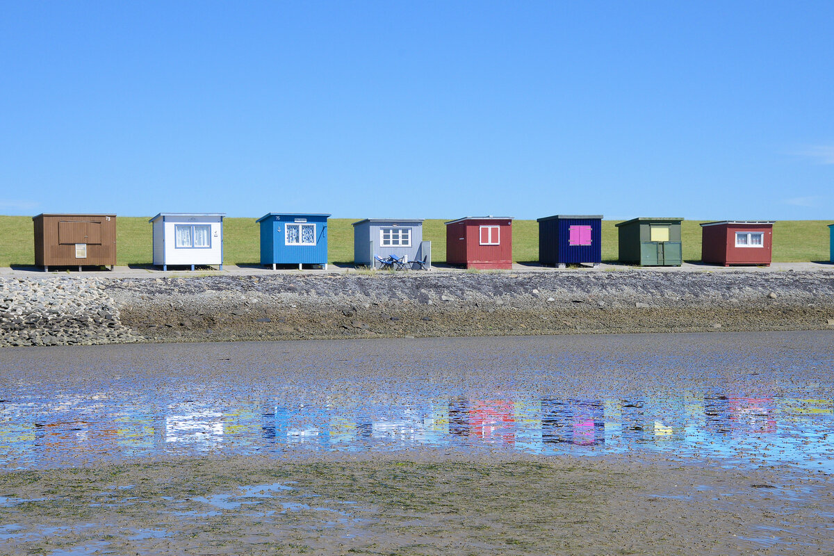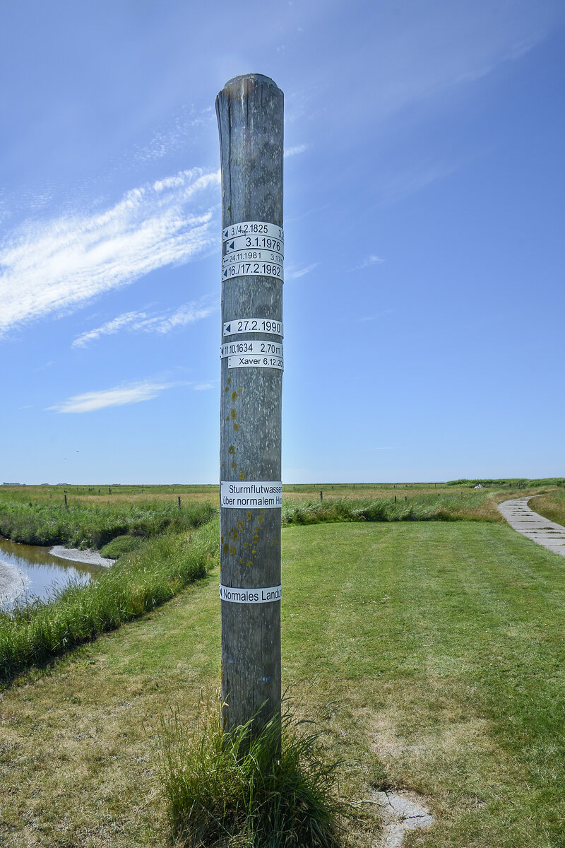 Sturmflutmarkierungspfahl auf der Hallig Oland im Nordfriesischen Wattenmeer. Aufnahme: 1. Juli 2025.