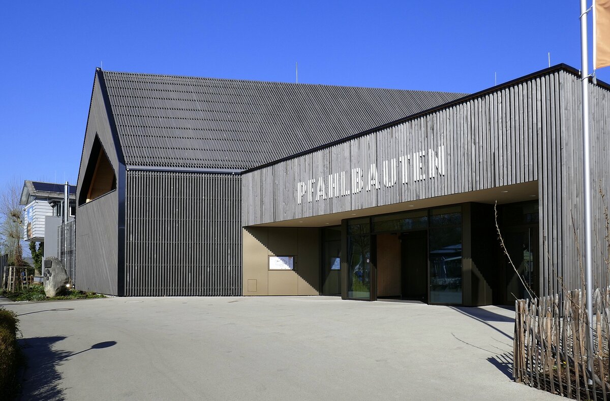 Unteruhldingen am Bodensee, das Eingangsgebäude des Pfahlbauten-Freilichtmuseums, April 2025