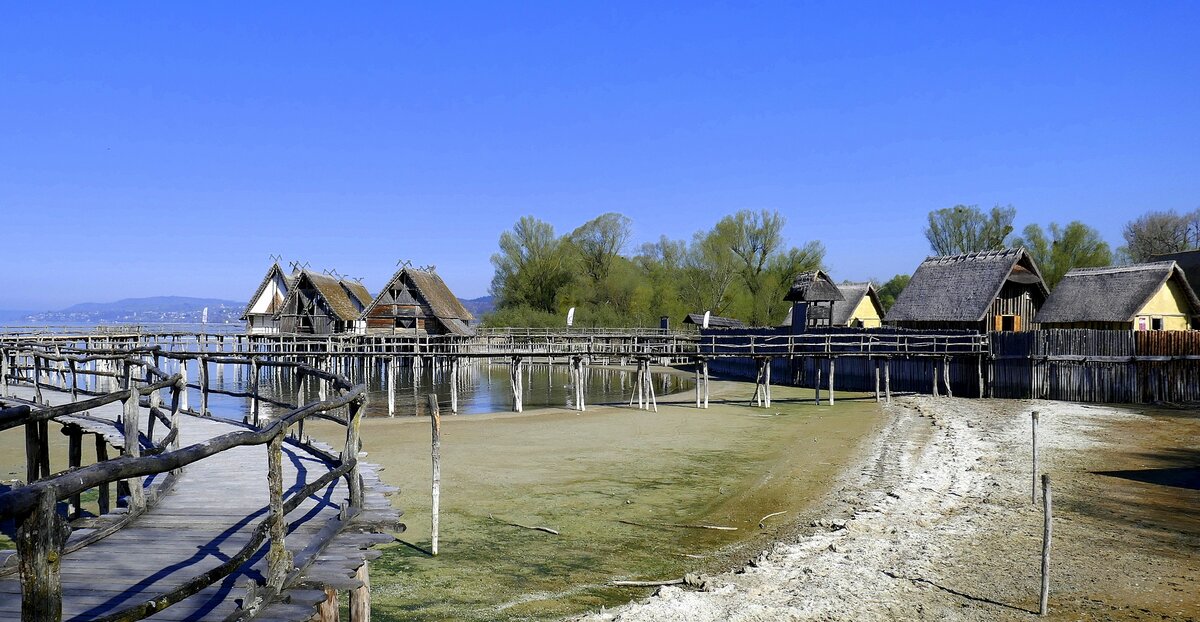 Unteruhldingen am Bodensee, Pfahlbauten-Freilichtmuseum, zeigt Nachbauten aus der Stein-und Bronzezeit, April 2025