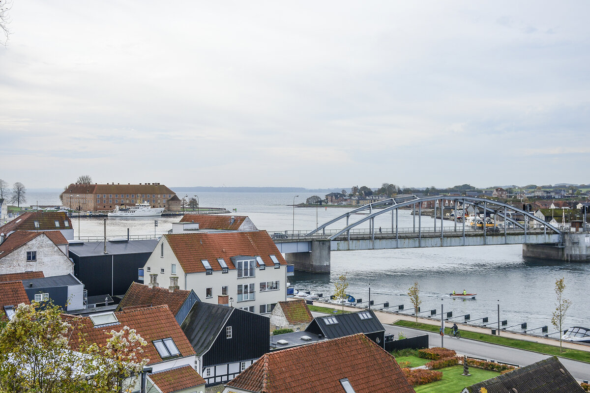 Aussicht über Sonderburg (dänisch Sønderborg) , den Alsensund und die König-Christian-X.-Brücke vom Jomfrusti. Aufnahme: 31. Oktober 2025.