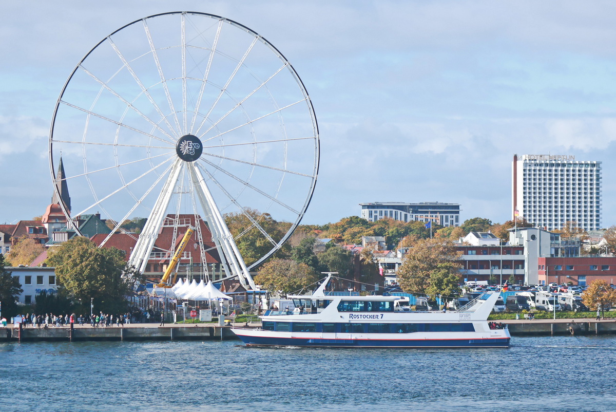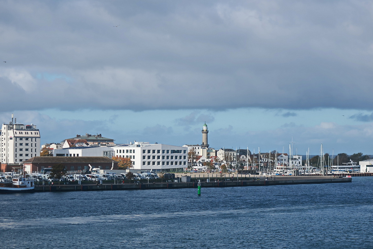 Blick vom Yachthafen nach Warnemünde am 16. Oktober 2025 bei Bewölkung.