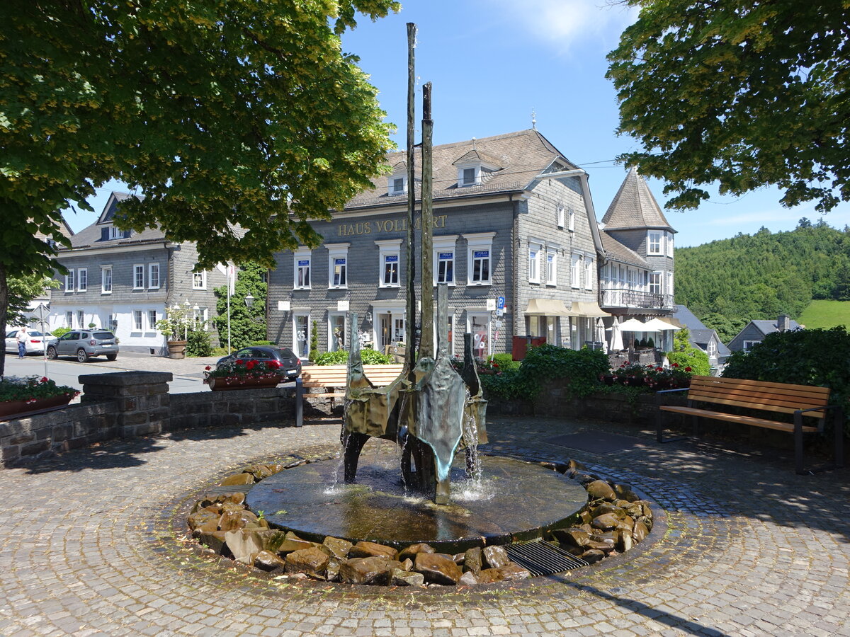 Schmallenberg, Brunnen und Häuser am alten Kirchplatz (20.06.2025)