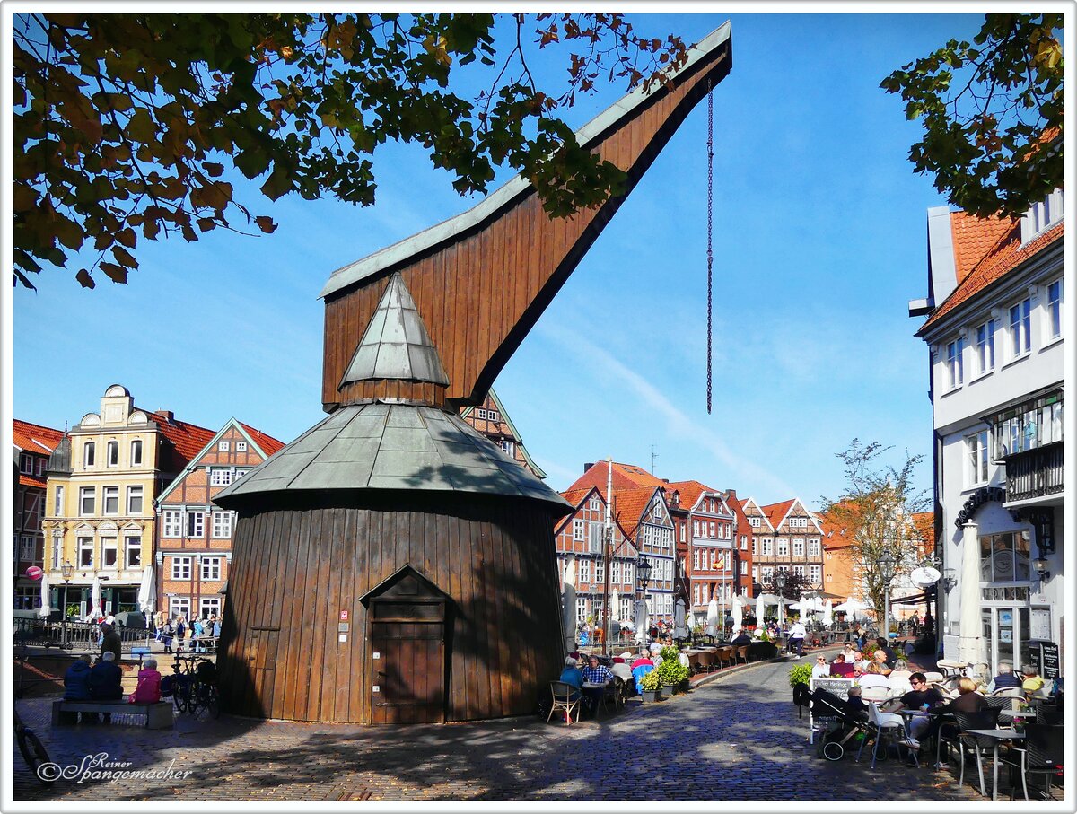 Stade am Fischmarkt, das historische Zentrum mit seinem Krahn am Hafen, erinnert an Lüneburg auch dort steht so ein Krahn an der Ilmenau. Ende September 2025.