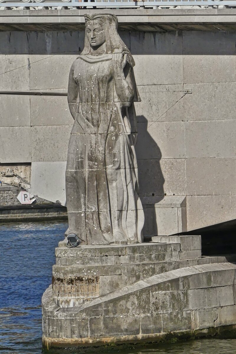 Die Frauenstatue soll den Widerstand gegen die deutschen Besatzer symbolisieren, am rechten Brückenpfeiler vom Pont des Arches über die Maas in Lüttich. 18.09.2025