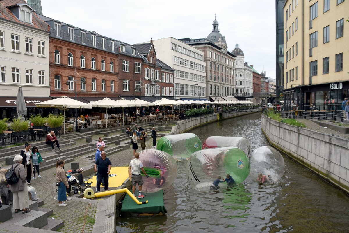 AARHUS (Midtjylland), 03.09.2023, Blick auf den Åboulevard, der Flusspromenade an der Aarhus Å, einem regulierten Wasserlauf