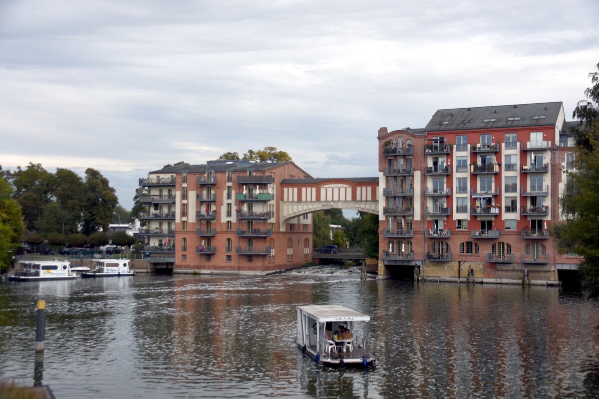 BRANDENBURG an der Havel, 29.09.2023, Blick von der Brücke über den Domstreng auf die ehemalige Burgmühle; das Gebäude wurde bei einem Brand 2002 völlig zerstört, wieder aufgebaut und enthält nun - höchstwahrscheinlich nicht ganz preiswerte - Eigentumswohnungen