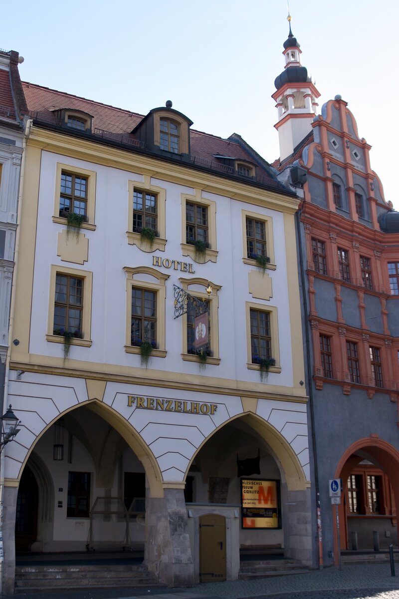 GÖRLITZ (Landkreis Görlitz), 27.09.2023, Blick auf den Frenzelhof am Untermarkt, erbaut im 15. Jahrhundert und eines der ältesten Hallenhäuser in Görlitz; rechts daneben ein Teil vom Schönhof, dem ältesten Renaissance-Gebäude der Stadt