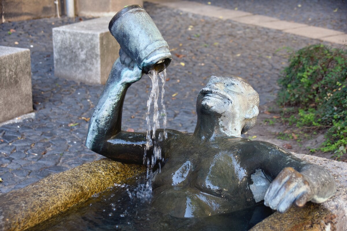 GÖRLITZ (Landkreis Görlitz), 27.09.2023, Teil eines Stadtbrunnens mit der sogenannten Zecherpaar-Skulptur; hier einer der Zecher