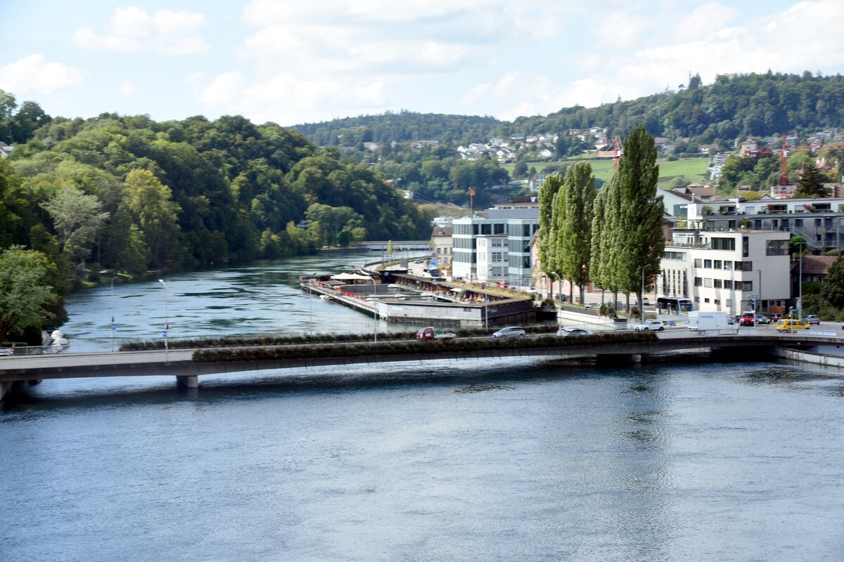 SCHAFFHAUSEN (Kanton Schaffhausen), 18.09.2024, Blick von der Eisenbahnbrücke Feuerthalen auf den Rhein und die Feuerthaler Brücke
