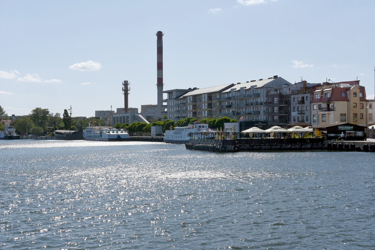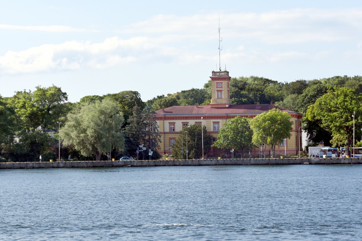 ŚWINOUJŚCIE, 07.07.2025, Blick über die Świna auf das Gebäude der Hafenmeisterei
