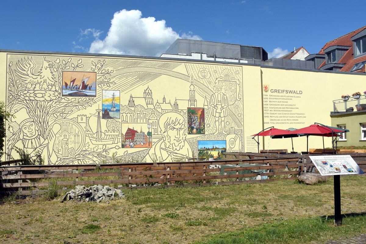 GREIFSWALD (Landkreis Vorpommern-Greifswald), 04.07.2025, Daten zur Stadtgeschichte an einer Gebäudewand in der Lappstraße