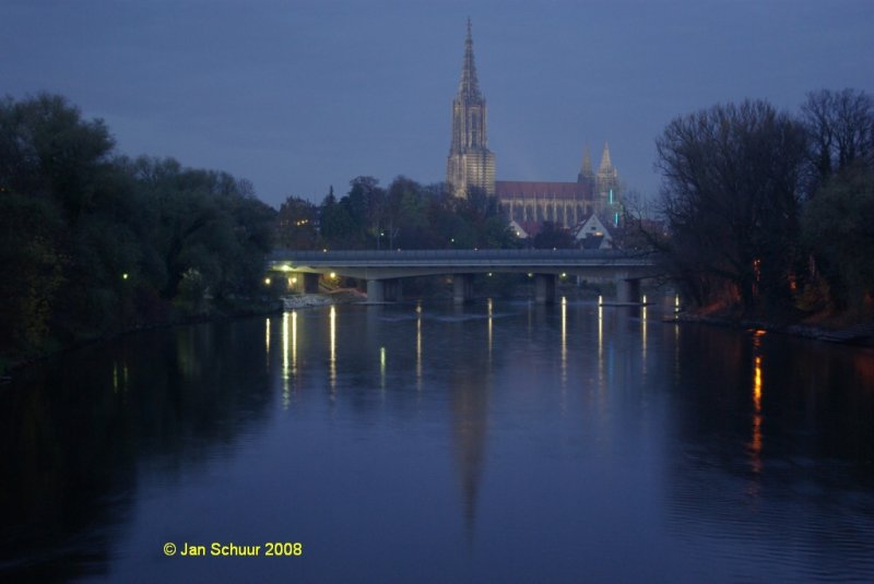 . Neues Wohnhaus neben dem Reichenauer Hof am Ulmer Donauufer. Die Turmspitze der Dreifaltigkeitskirche blickt über das Dach.