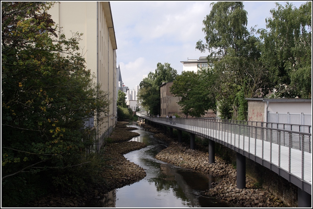 Der neugeschaffene Haseuferweg in Osnabrück ermöglicht einen Gang durch die Innenstadt abseits vom Lärm und bietet neue Einblicke. Dieses Teilstück zwischen Schlagvorderstraße und Wittekindstraße wurde auf Pfählen errichtet und erst im August freigegeben. 10.09.2011