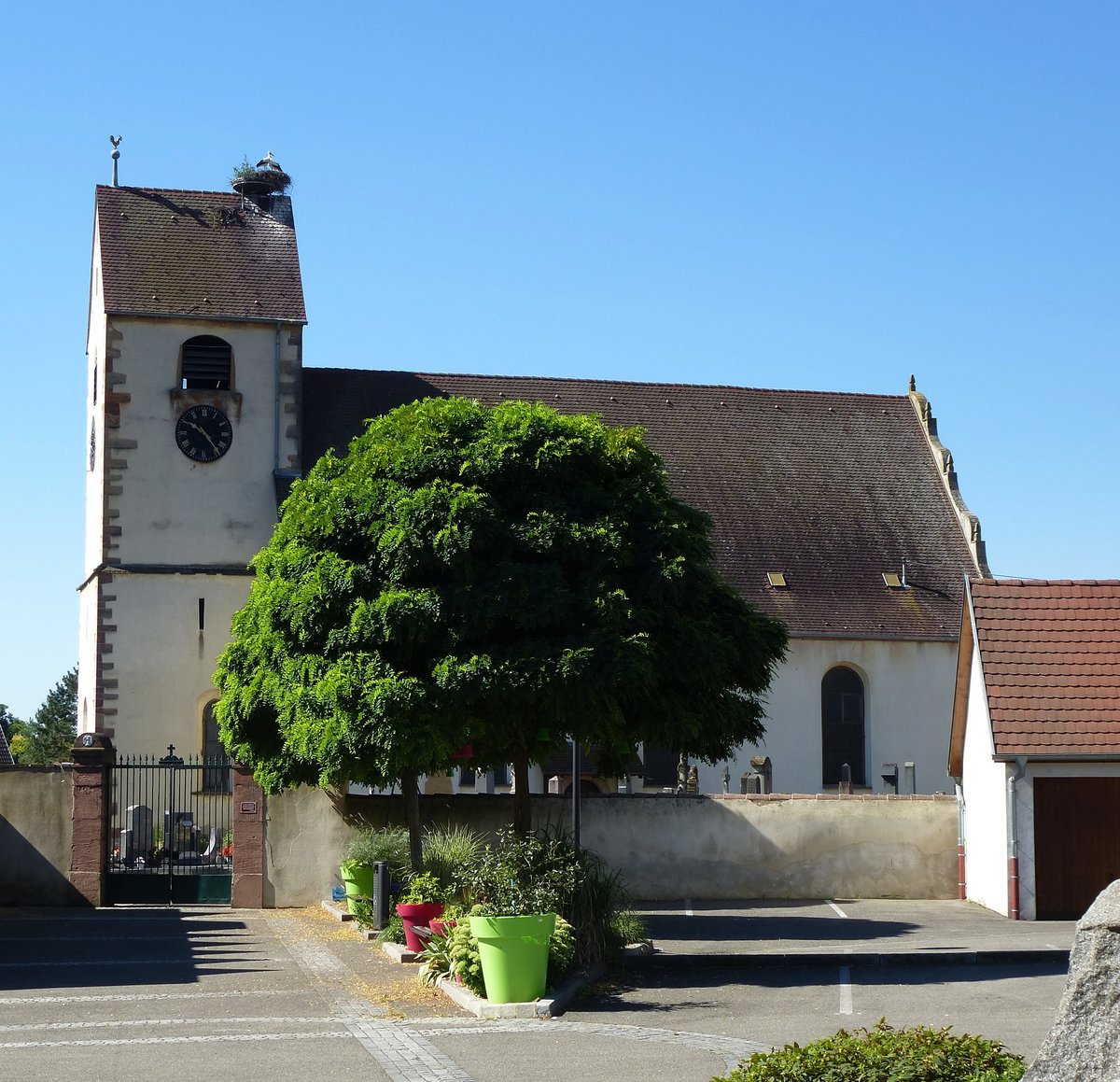 Andolsheim im Elsaß, die Lutherische Kirche St.Georg, war von 1687-1883 Simultankirche, Juli 2016