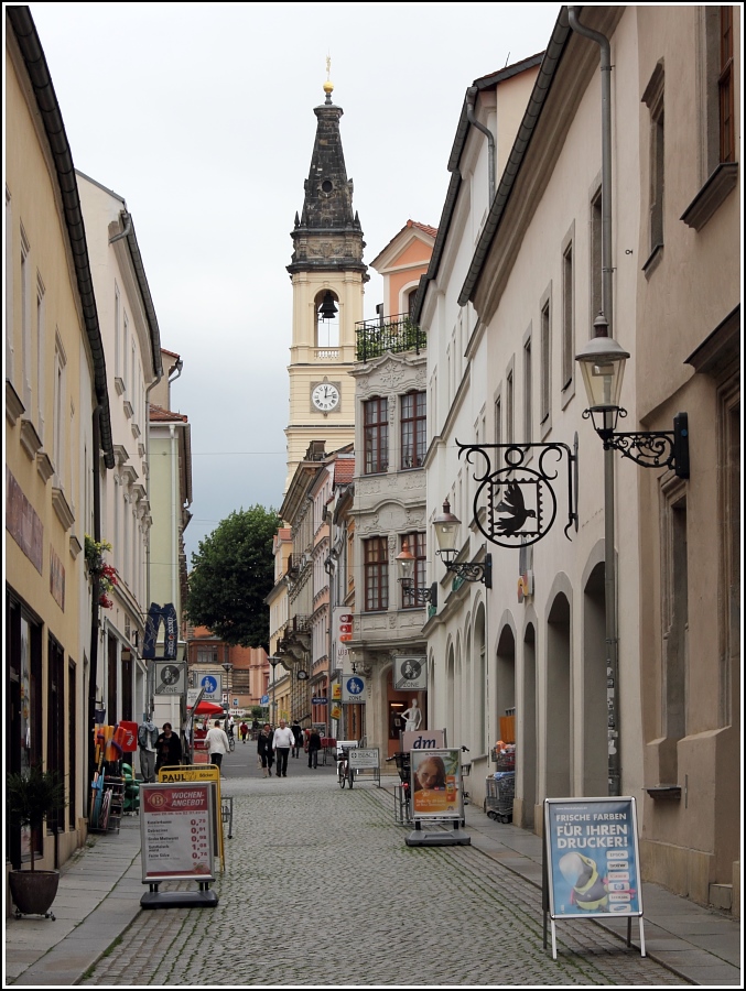 Zittau. Blick durch die Bautzner Straße zum Turm des Johanneum (heute Christian-Weise-Gymnasium). 21.06.2016