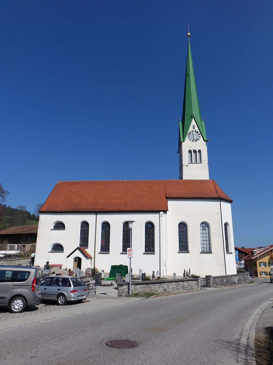 Sulzberg, Pfarrkirche Hl. Dreifaltigkeit, Saalbau mit eingezogenem Chor und nördlichem Turm mit Spitzhelm, im Kern 15. Jahrhundert, Anbau der Seitenkapellen vor 1493, Erweiterung des Langhauses um 1730 (27.03.2017)