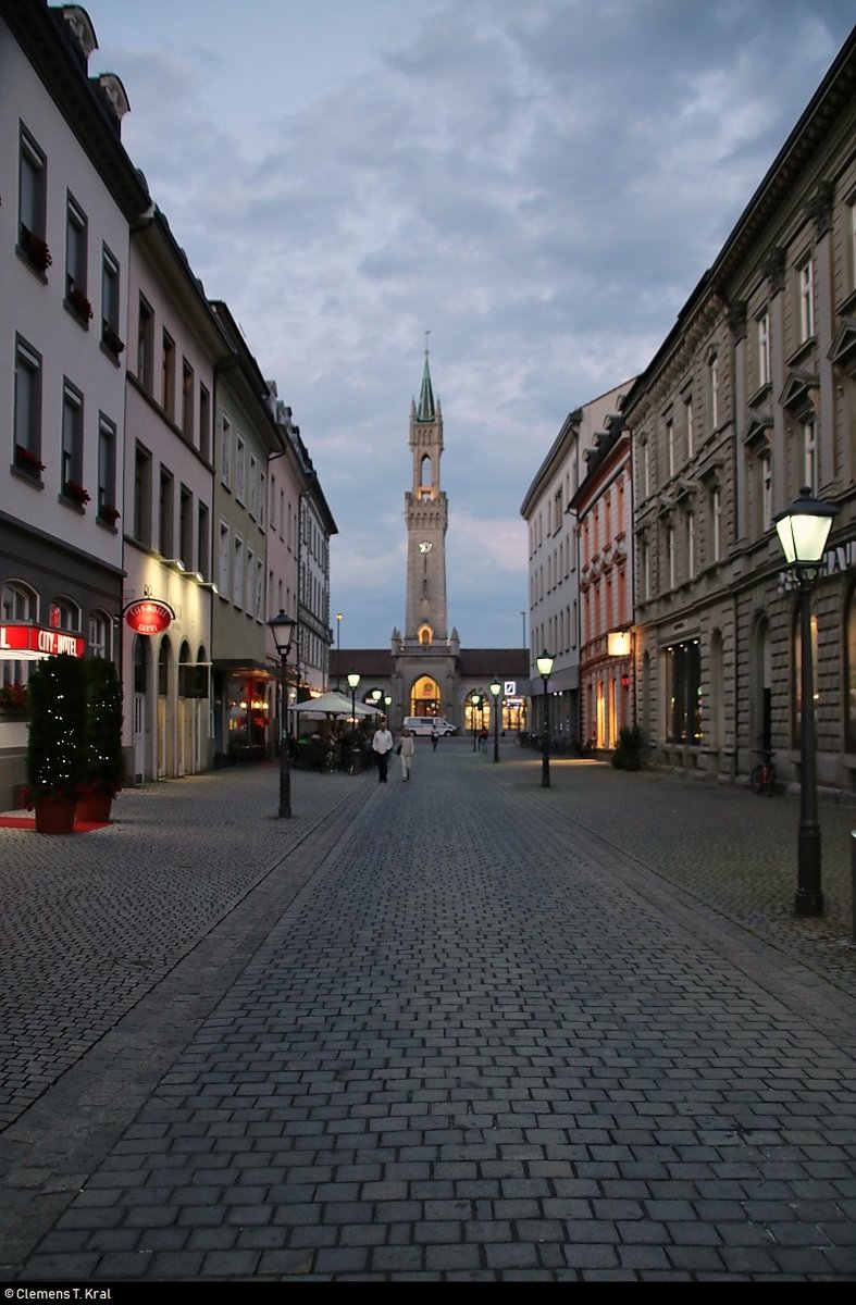 Blick auf die Bahnhofstraße in Konstanz am Abend. Wie der Name schon sagt, befindet sich am Ende der Straße der Bahnhof mit seinem markanten Turm. [8.7.2018 | 21:39 Uhr]