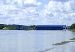 Rhinau/Elsaß, Blick auf die Staustufe am Rhein, eine von 10 derartigen Anlagen am Oberrhein, erbaut 1963, rechts das E-Kraftwerk, links die Schleusenanlage, Aug.2024