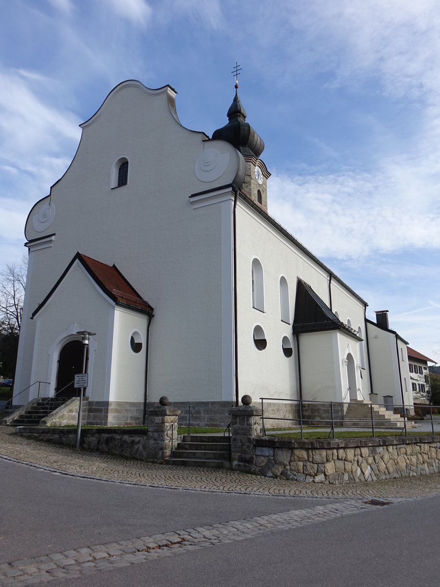 Drachselsried, neubarocke kath. Pfarrkirche St. Ägidius, Saalkirche mit Steildach und Schweifgiebel, erbaut von 1922 bis 1923 (04.11.2017)