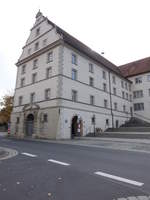Fladungen, ehem. Zehnthaus, dreigeschossiger massiver Zweiflügelbau mit Volutengiebel, erbaut von 1601 bis1626, heute Rathaus (16.10.2018)
