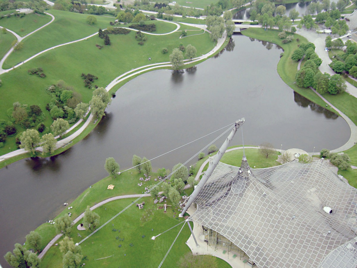 Blick auf Olympiapark vom Olympiaturm in München. Aufnahme: 5. Mai 2005.