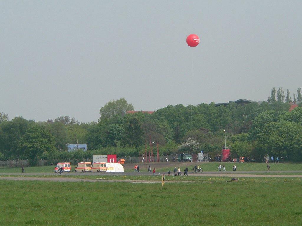 Drei Ein- und Ausgänge gibt es derzeit am neuen Park auf dem alten Flughafen Tempelhof, sie sind markiert mit roten Ballons. Das ist bei dem kilometerweiten Gelände mehr als hilfreich. 9.5.2010 Thomas Wendt
