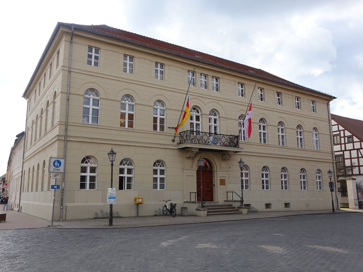 Luckenwalde, Rathaus am Markt, dreigeschossiger klassizistischer Putzbau, erbaut von 1843 bis 1844 (10.03.2026)