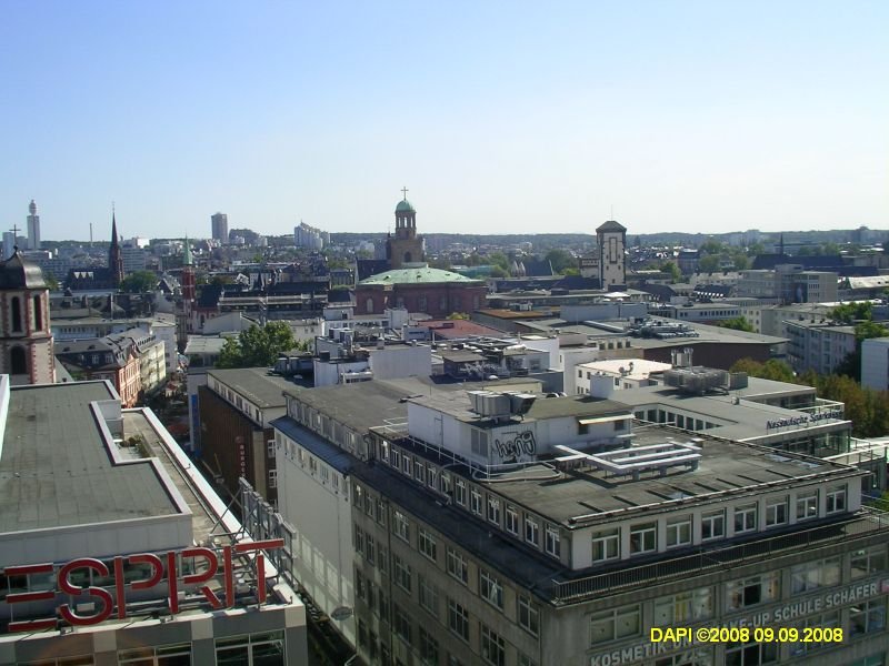 Blick von der Zeilgalerie in Richtung Süden. Zu sehen sind die Paulskirche und der Henninger-Turm.