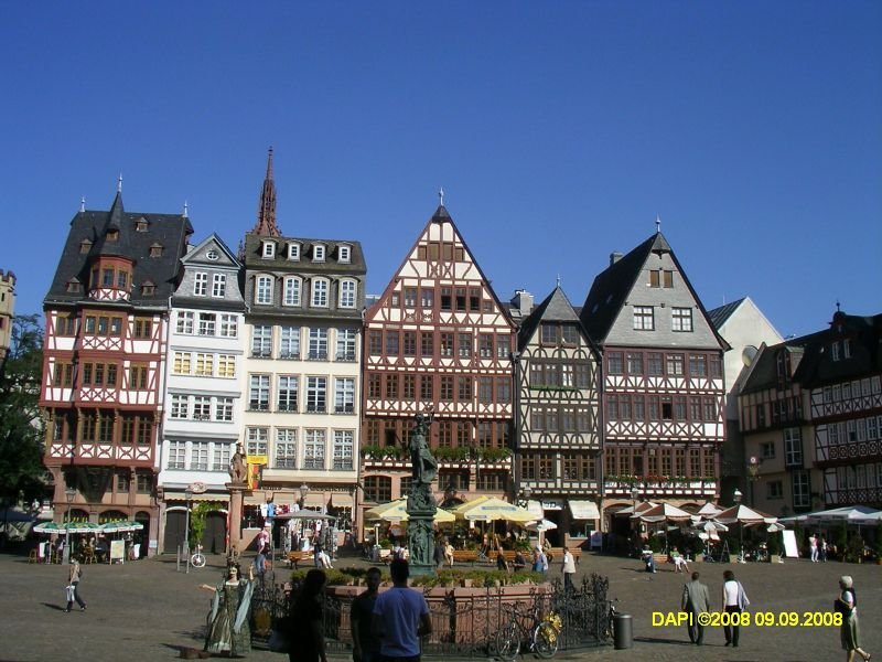 Fachwerkhäuser am Römerberg. Im Vordergrund befindet sich der Gerechtigkeitsbrunnen