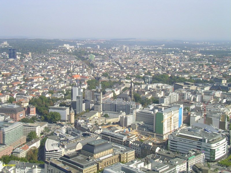 Blick vom Main Tower Richtung Westen. Unten links: Die Frankfurter Börse.